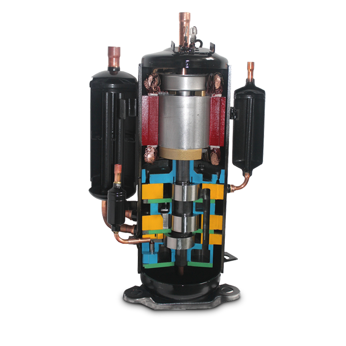 三缸雙級(jí)變?nèi)莘e比壓縮機(jī)可實(shí)現(xiàn)兩 種不同容積比的雙級(jí)壓縮,可降低單個(gè)氣缸的壓縮比,減小了 泄漏量,提高了壓縮機(jī)的容積效率,與單級(jí)壓縮系統(tǒng)相比,雙 級(jí)增焓壓縮系統(tǒng)具有能力高、能效高和可靠性高的優(yōu)勢(shì),使用 在家用熱泵空調(diào)、多聯(lián)式熱泵空調(diào)、戶用冷水熱泵機(jī)組等多種 類型的熱泵產(chǎn)品中。