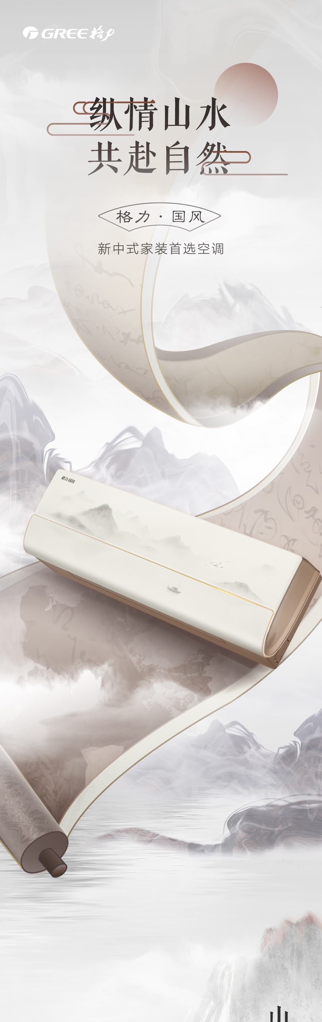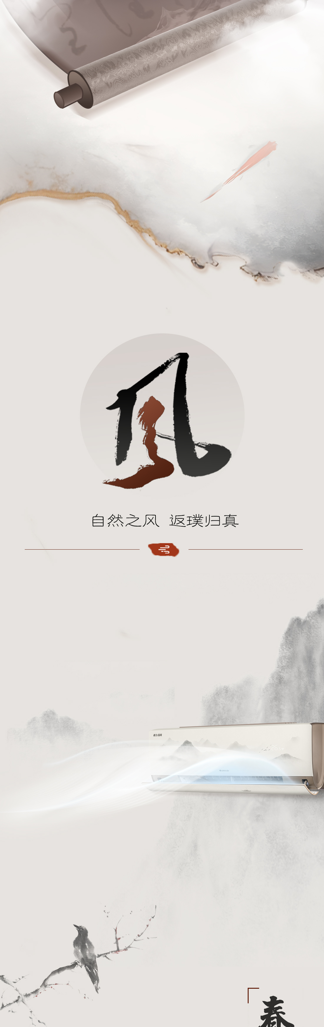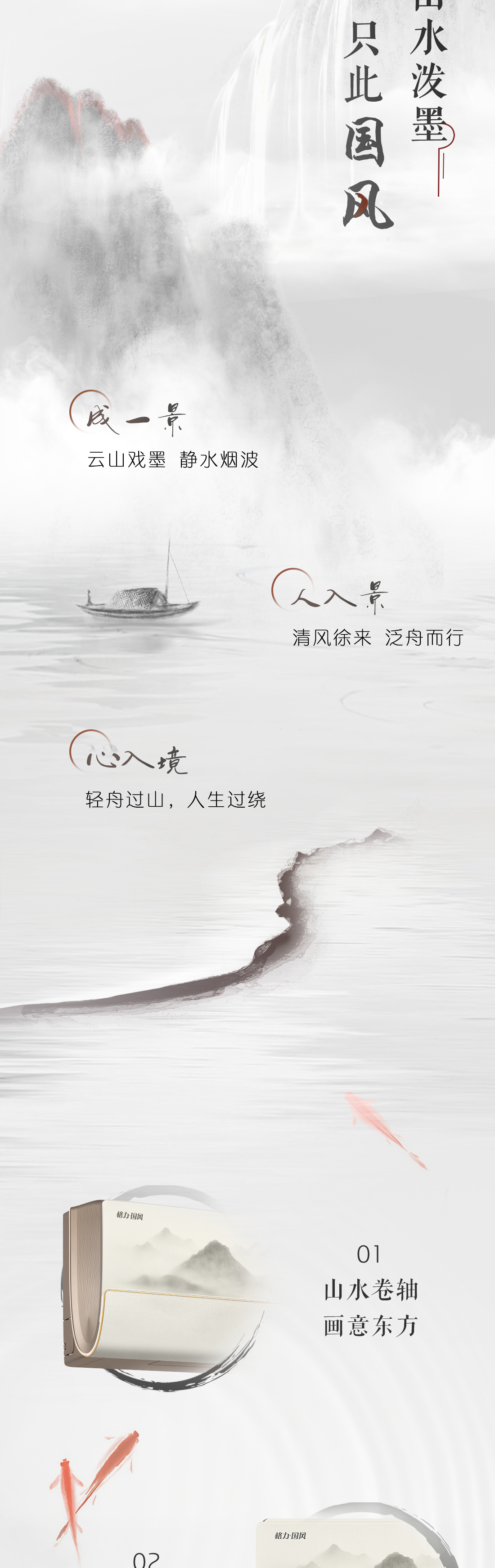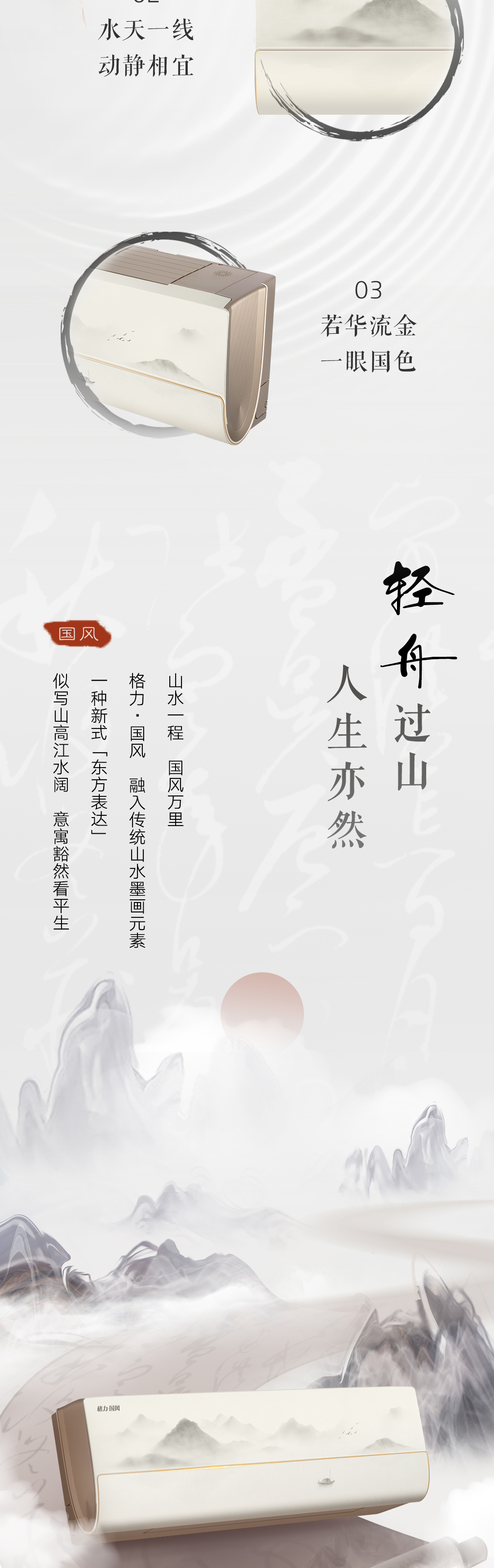 以國風山水入畫,打造新中式家裝的首選空調。畫軸中從畫中景,到人入景,再到心入境,層層遞進,將游人的情感逐層推向高潮,傳遞出“輕舟過山,人生亦然”的淡然、闊達的人生理念。
